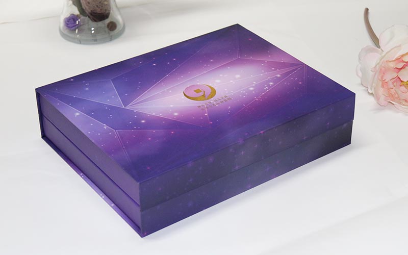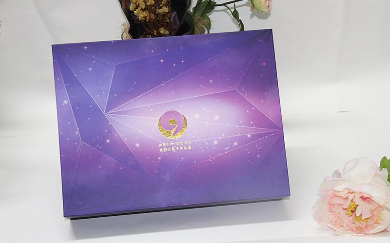 1.材質:盒子面紙採用157G銅版紙,表面彩色印刷,線條UV光油,LOGO文字燙金。裱1500G雙灰闆,盒子爲藍,紫兩個顔色,内托爲白色内盒裏面全部貼滿彩紙,盒型爲上下翻蓋盒磁鐵要有吸度。